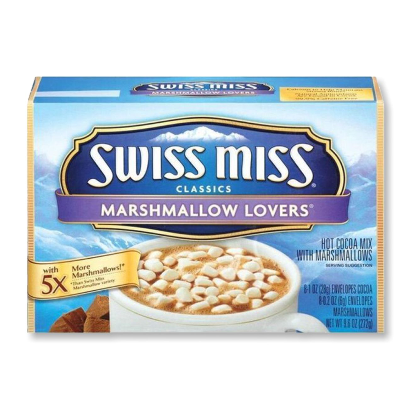 Swiss Miss Marshmallow Lovers hat separate Umschläge mit der 4,5-fachen Menge Marshmallows der regulären Swiss Miss Hot Cocoa Mix mit Marshmallows.