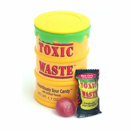 Toxic Waste Hazardously Sour Candy gilt als eine der mundverziehendsten Süßigkeiten da draußen. Sie kommen in einer Mini-Münztrommel für Giftmüll, verpackt mit einzeln verpackten Kugeln in Geschmacksrichtungen wie Limette, Kirsche, Erdbeere, Zitrone, Blaue Himbeere und Traube.